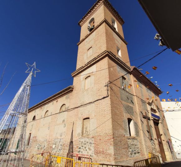 El exterior sigue la fisonomía de muchos templos mudéjares propios del Reino de Granada III, muros rectilíneos con escasa decoración, que dejan ver su fábrica y se coronan por grandes cornisas de ladrillo enlucido y pintado de color rojo ladrillo.